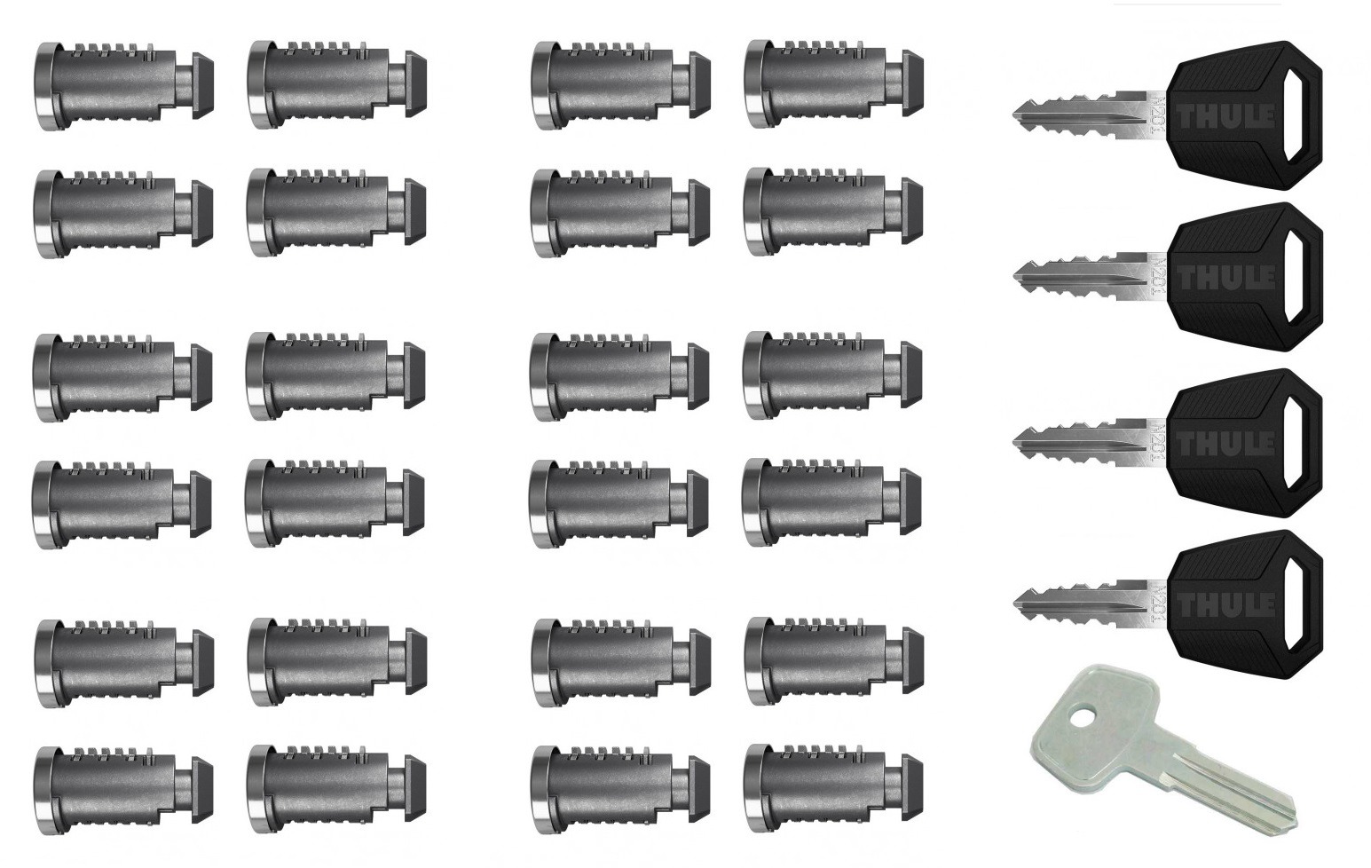 24 slotcilinders, 4 sleutels en Master Key. Stel al uw Thule producten op deze herbruikbare 24-delige slotenset en gebruik steeds dezelfde sleutel voor uw dakkoffer; dakdragers en fietsendrager.
